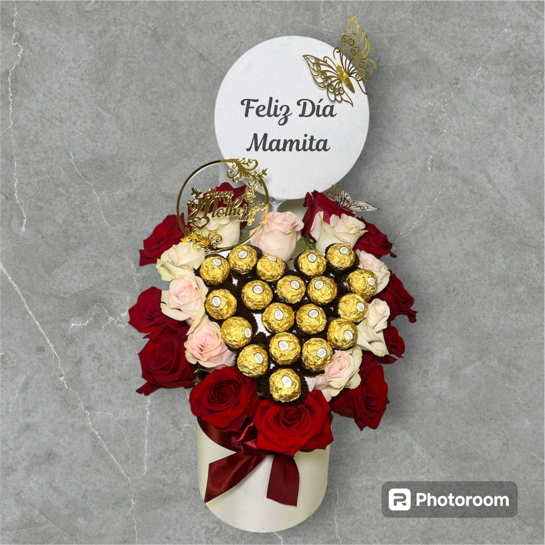 Rosas rojas y blancas, chocolates ferrero. Agrega un mensaje personalizado.