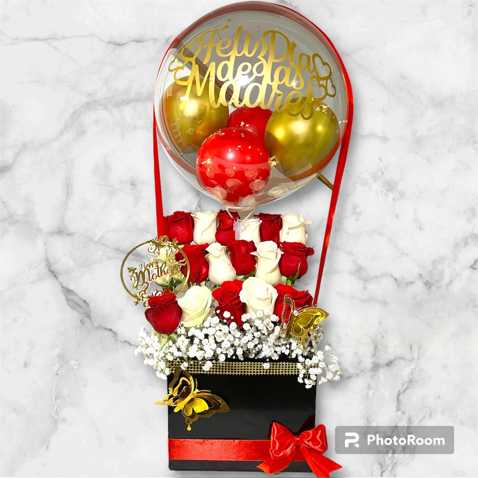 Rosas blancas y rojas , globo con mensaje personalizado . Tamaño grande